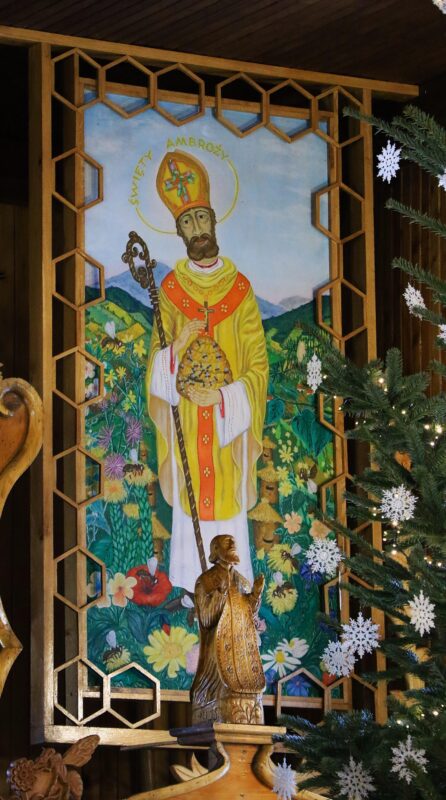 Święty Ambroży, biskup Mediolanu, w ikonografii chrześcijańskiej przedstawiany jest z księgą, pastorałem i… rojem pszczół. Według przekazów to właśnie te niezwykłe owady miały złożyć na jego ustach krople miodu w dniu narodzin, zapowiadając dar słowa, mądrości i odpowiedzialności. Z biegiem wieków stały się symbolem nie tylko wymowy i mądrości, lecz także pracowitości, porządku i troski o dobro wspólne — wartości tak bliskich polskim pszczelarzom.